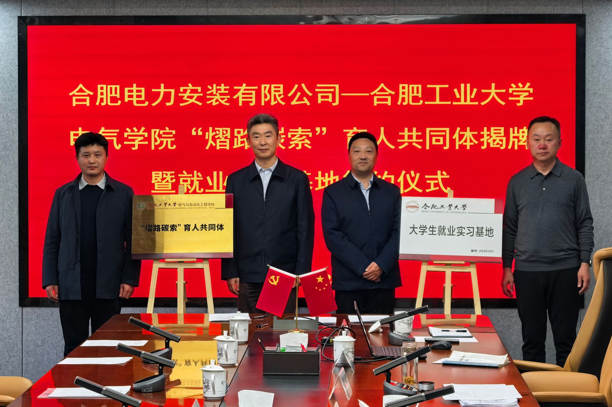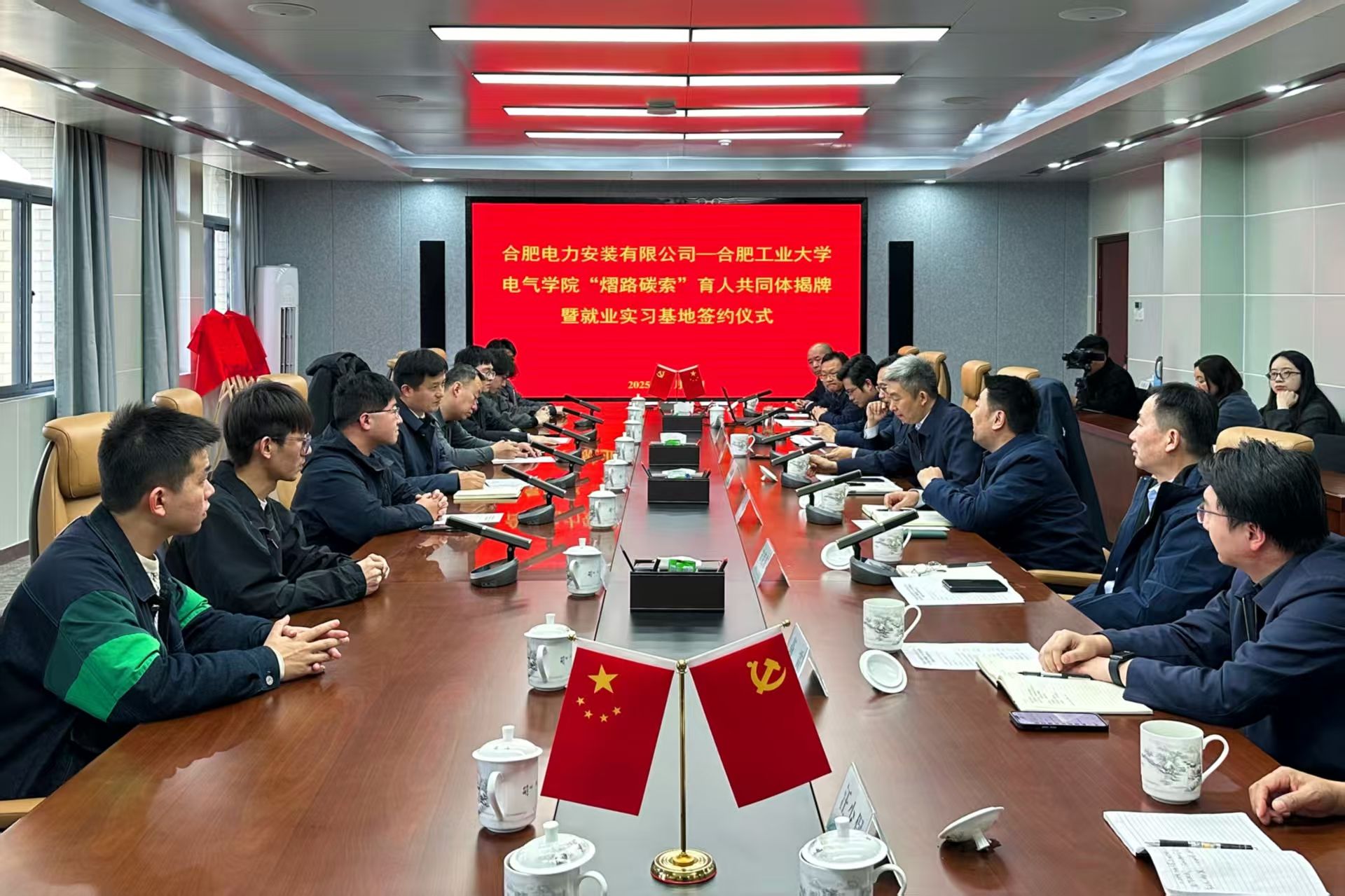 11月26日下午,澳门新甫京娱乐娱城平台师生赴合肥电力安装有限公司参观交流,并举行“熠路碳索”育人共同体和大学生就业实习基地签约揭牌仪式。